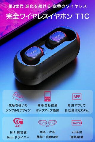 【楽天1位 第3世代 進化版】完全 ワイヤレスイヤホン bluetooth イヤホン ブルートゥース イヤホン ワイヤレス イヤフォン 自動ペアリング HiFi 高音質 カナル型 両耳 片耳 マイク付き 長時間 通話 防水 スポーツ スマホ iPhone Android 対応 QCY T1C [黒 / 白 ]