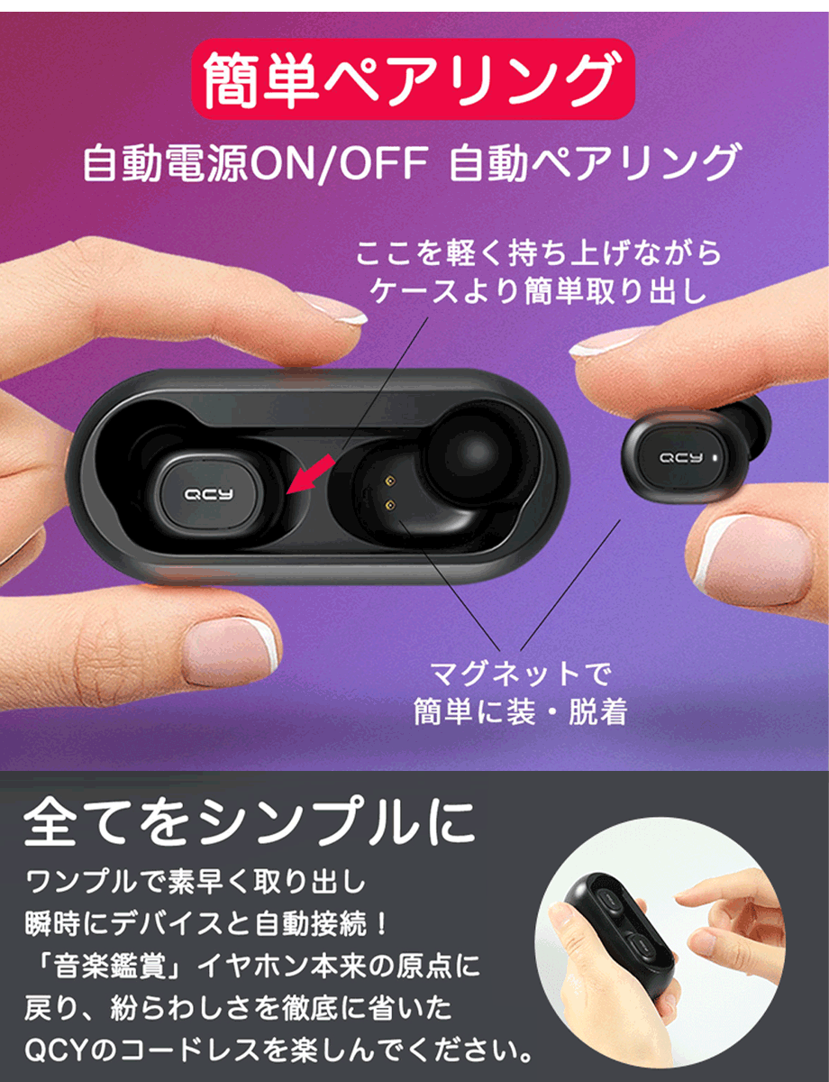 第3世代 QCY T1C オススメポイント 自動ペアリング 左右分離型 シンプルな操作性を実現した 完全ワイヤレス bluetooth イヤホン ワイヤレス ヘッドホン 【QCY公式アプリ対応】 これまでの T1 の機能はそのままに、 QCY アプリ に対応させた最新型の「 QCY-T1C 」。