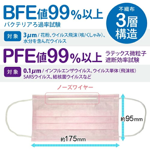 3層・ノーズワイヤー、ソフトゴム BFE99%以上 サイズ:95×175mm 1箱50枚入り 製造国:中国 ※ASTMとは、日本のJISのように米国で様々な材料の基準定めている規格です。