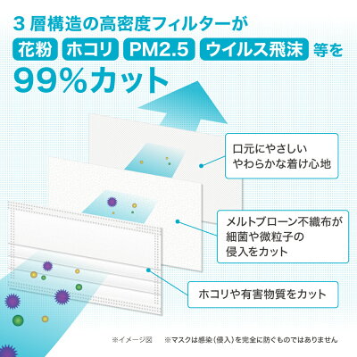 3層の不織布構造でウィルス飛沫、ほこり、花粉等のミクロ粒子をシャットアウト。